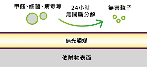 無光觸媒主要成分是超納米微分子磷酸二氧化鈦化合物。超納米微分子磷酸二氧化鈦是具有 2~50 納米一次元細孔構造的物質,表面積可達 700 m2/g,噴塗到物體表面呈現為無機酸非晶體聚合物薄膜,乾燥後形成納米尺寸的微細孔結構。